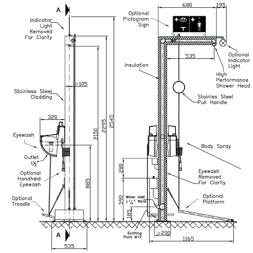 PremiumLine freestanding frost protected heated emergency safety shower with additional body spray nozzle and eye-/face wash unit with bowl and lid