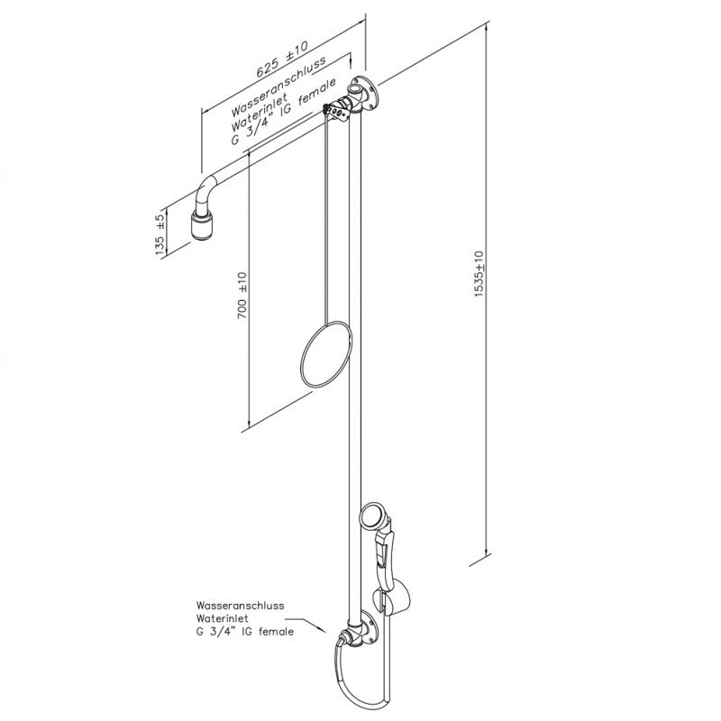 Body safety shower with hand-held eye shower, wall mounted, exposed pipework